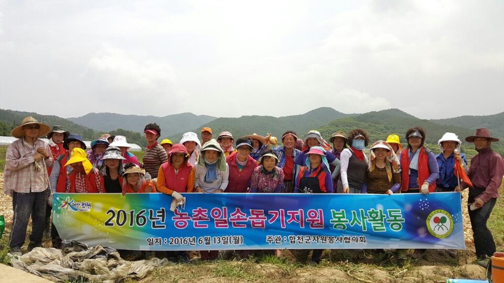 합천군자원봉사협의회에서는 매년 상·하반기 2회에 걸쳐 농촌일손돕기 봉사활동을 하고 있으며, 이외에도 거동불편 저소득 노인 식사배달, 어려운 노인 생신상 차려드리기 및 김장나눔봉사, 시설방문 목욕봉사 활동, 환경정화활동, 각종 문화ㆍ체육 행사 도우미 등 따뜻한 손길이 필요한 지역사회 곳곳에서 지속적인 봉사활동을 펼쳐나가고 있다.