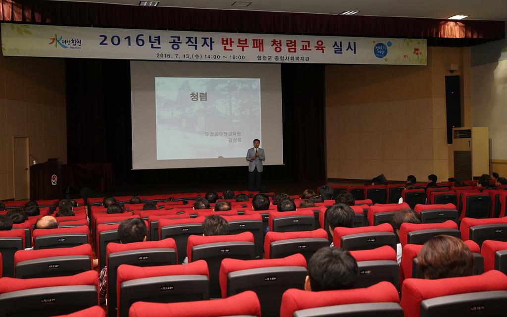 합천군(군수 하창환)은 13일 종합사회복지관 3층 대강당에서 군청 간부공무원을 비롯한 직원 300여명이 참석한 가운데 전 우정공무원교육원 교수실장을 지낸 김성룡 강사를 초빙해 반부패 청렴교육을 실시했다.