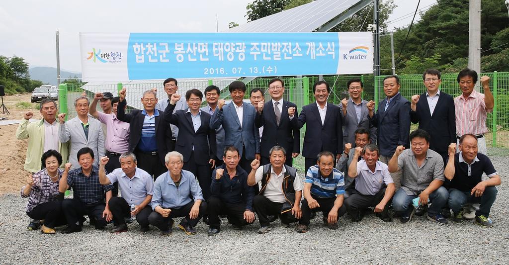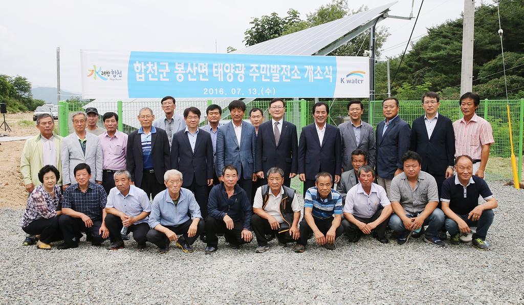 하창환 합천군수는 “정부의 녹색정책에 부합하는 사업으로 지난 2013년 수상 태양광 발전 시설에 이어 봉산면 주민 태양광발전소가 준공됨으로써, 지역사회 발전과 주민복지를 증진하고, 환경 위기에 적극 대응할 수 있는 주민들의 소득과 직접 연계될수 있을 것”으로 기대하였다.