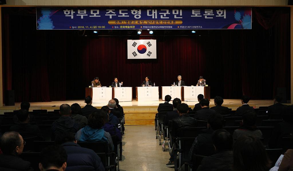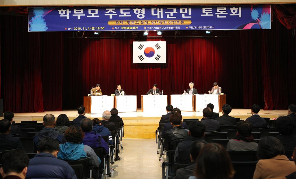 (사)합천군교육발전위원회(이사장 하창환) 산하의 합천군 명문고육성 추진협의회(위원장 임춘지)는 명문고 육성과 남녀공학에 대한 군민의 의견을 수렴하고자 지난 11월 4일 문화예술회관에서 하창환 이사장, 김성만 군의회의장, 박성홍교육장, 학부모 등 100여명이 참여한 가운데 군민 대 토론회를 개최하였다.