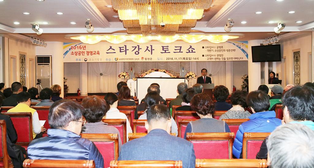 합천군(군수 하창환)은 17일 금강예식장에서 경기침체와 매출 부진 등으로 어려움을 겪고 있는 관내 소상공인들 100여명을 대상으로 스타강사와 함께하는 ‘스타강사 토크쇼’를 개최했다.