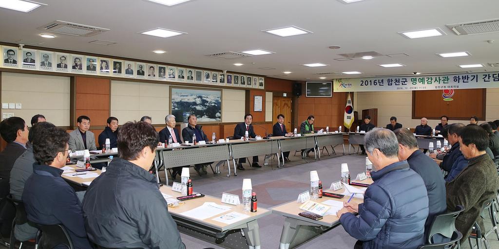 합천군(군수 하창환)은 20일 군청 3층 대회의실에서 하창환 군수와 명예감사관 32명이 참석한 가운데 ‘군민에게 믿음을 주는 청렴한 합천 실현’을 주제로 하반기 명예감사관 간담회를 개최하였다.