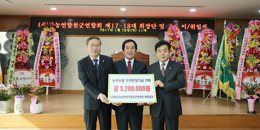 이·취임식 행사에서 농업경영인합천군연합회 회원의 뜻을 모아 합천군 농축산물가격안정기금 100억 원 조성에 조그마한 보탬이 되고자 기탁금 520만원을 하창환 군수에게 전달했다.