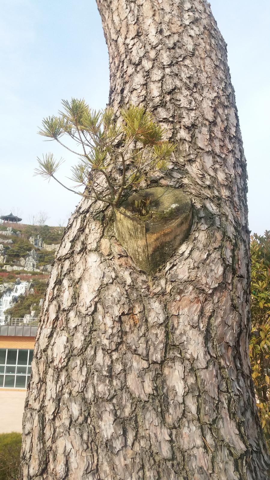 천년의 마당 가장자리에 있는 일명 ‘애기를 품은 소나무(애품소)’는 큰 소나무의 잘린 가지 자리에 자라는 작은 소나무로 큰 나무에서 떨어진 씨가 발아하여 자라고 있는 모습이 마치 엄마 품에 안긴 애기 소나무처럼 보여 신비감을 자아낸다.