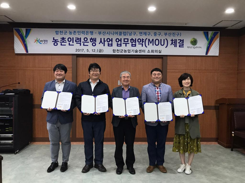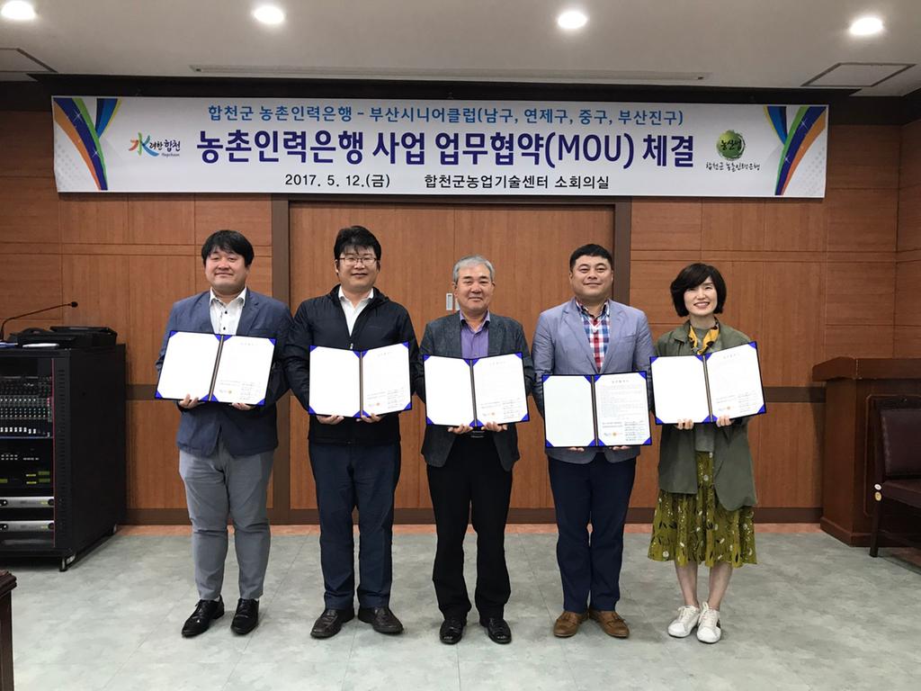 합천군 농촌인력은행 사회적협동조합(이사장 김신조)은 5월 12일 오전 합천군농업기술센터 2층 소회의실에서 부산시니어클럽(남구, 연제, 중구, 부산진) 과 농촌인력은행 사업의 도시인력 유치를 위한 업무협약을 체결하였다.