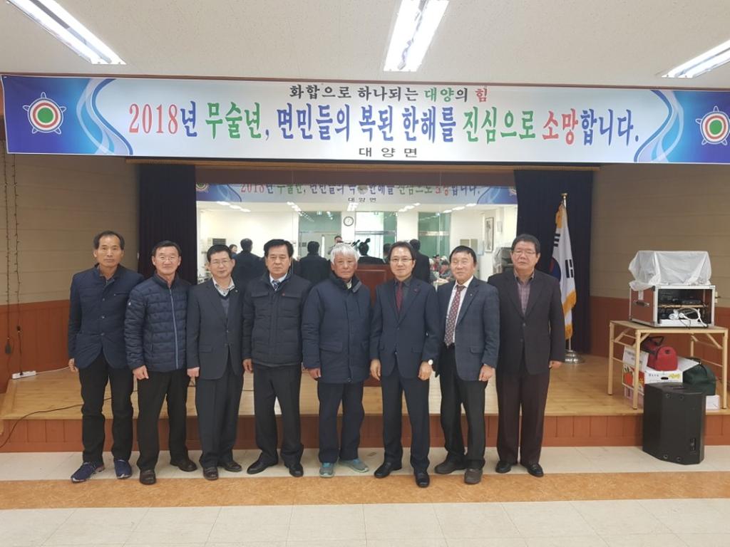 업무시작에 앞서 가진 의식행사에는 추찬식 면장 외 전직원, 군의회 허종홍 부의장, 배몽희 의원, 심성호 우체국장을 비롯한 기관장과 임직원, 이장단협의회 강상수 회장 외 15개마을 이장, 대양면노인회 심경섭 분회장, 주민 등 60여명이 참석한 가운데 표창장 전수, 신임이장 임명장 수여, 신년인사 순으로 진행됐다.