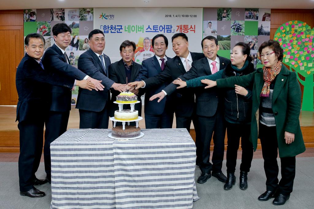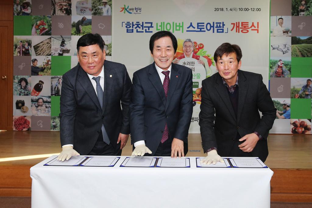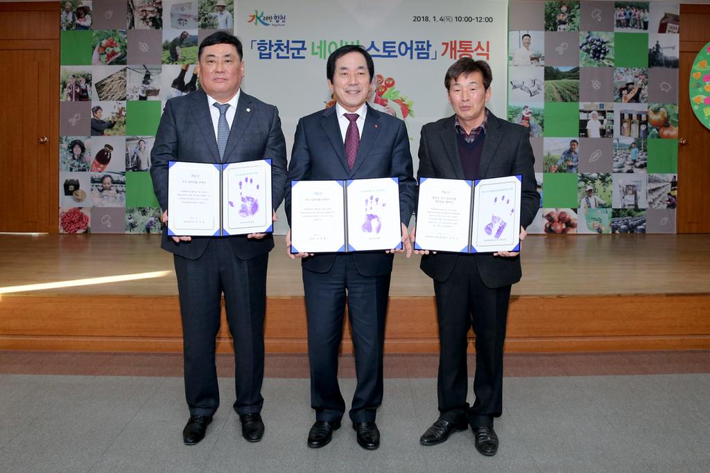 합천군(군수 하창환)에서는 4차산업 혁명이라는 시대의 요구에 부응하고, 농업6차산업 육성을 통하여 농가의 혁신적 새로운 소득원 창출과 농산물 판로 확대를 위하여 전국 지자체 최초로 대표 포탈사이트인 ‘네이버 스토어팜’에 ‘합천파머스’를 구축하였다. 이를 기념하기 위해 1월4일(목) 농업기술센터에서 하창환 군수, 김성만 의회의장 및 산업건설위원회 의원, 농가 등 100여명이 참석한 가운데 입점 기념식을 가졌다. 이날, △ 합천군에서는 입점 농가의 농특산물에 대한 안전성, 우수성을 인정하고 △ 합천군의회에서는 품질을 보증하여 추천하며 △「합천군팜앤파머스협동조합」농가는 소비자에 대한 무한한 신뢰를 확보하기 위해 안전하고 우수한 상품을 공급한다는 확약을 하는 핸드 프린팅을 하는 뜻 깊은 자리도 가졌다.