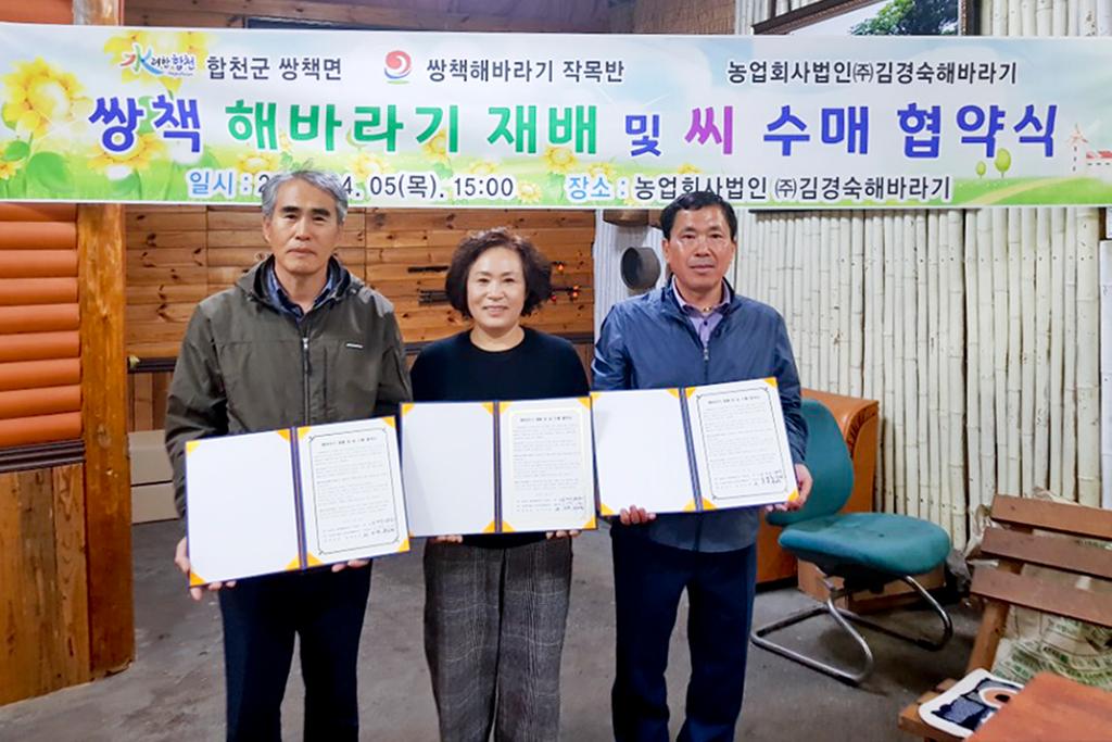 합천군 쌍책면(면장 최진현)은 5일 제주시 소재 ㈜김경숙해바라기 농장에서 쌍책해바라기작목반, 농업회사법인 ㈜김경숙해바라기와 쌍책해바라기 재배 및 씨 수매에 관한 업무협약을 체결했다.
