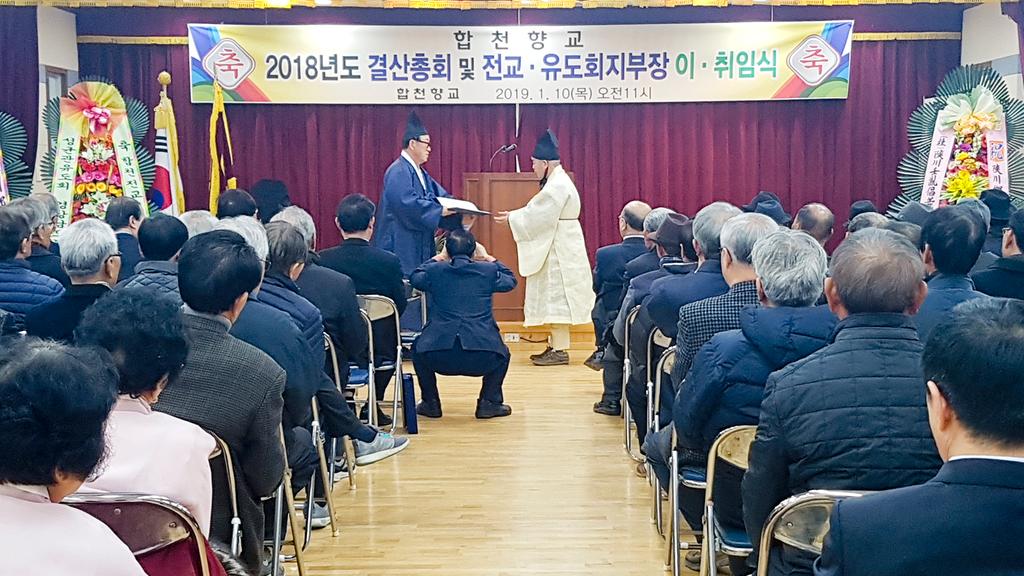 이날 행사 진행은 1부 정기총회를 마친 후 2019년도부터 새롭게 합천향교를 이끌어 나갈 신임 전교 및 유도회장 이‧취임식을 가졌다.