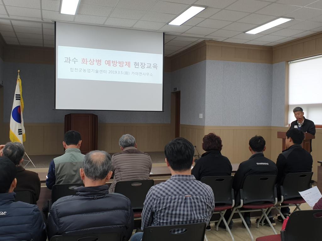 합천군(군수 문준희)은 3월 5, 6일 2회에 걸쳐 가야면사무소 및 농업기술센터 황가람 농업농촌활력센터에서 관내 사과, 배 재배농가 70여명을 대상으로 과수 화상병 예방방제를 위해 현장교육과 함께 방제 약제를 무상 공급했다.