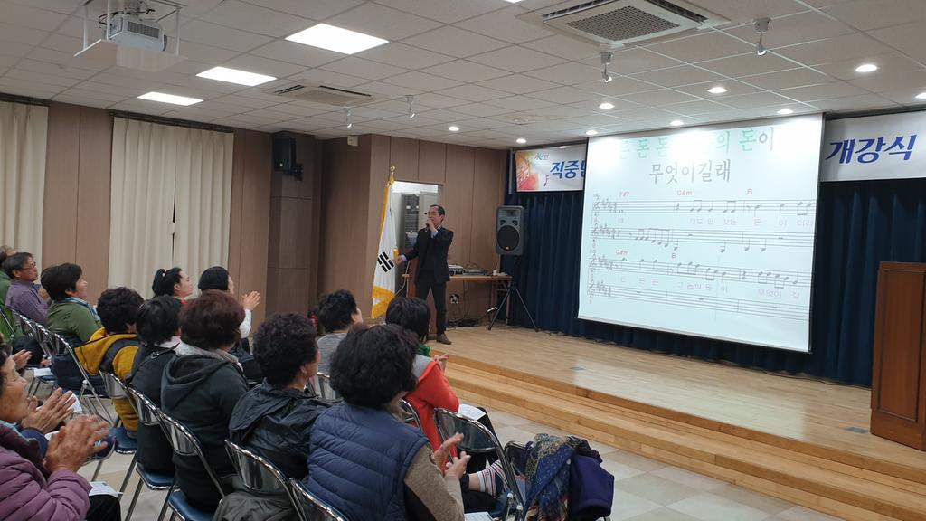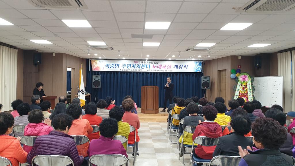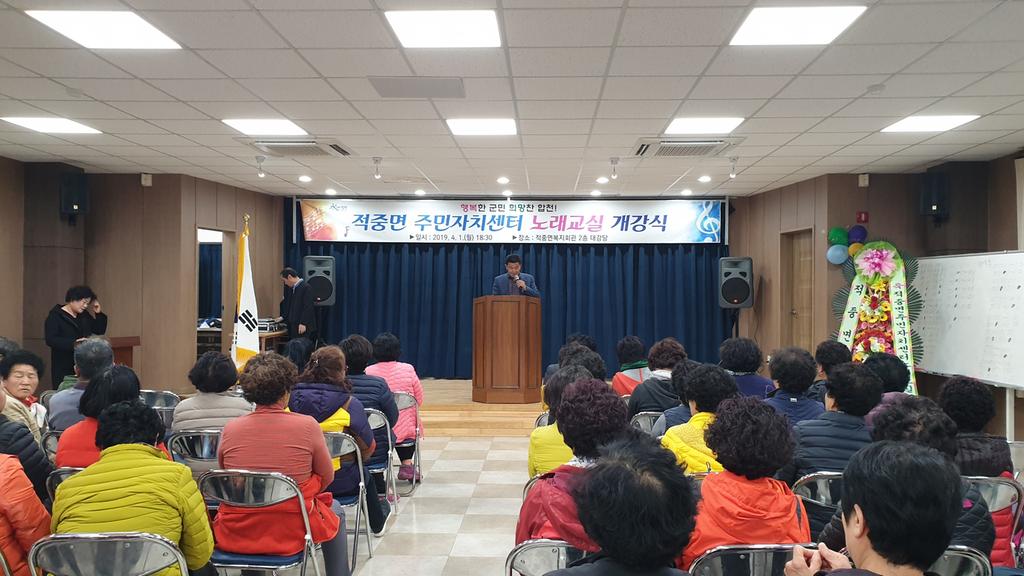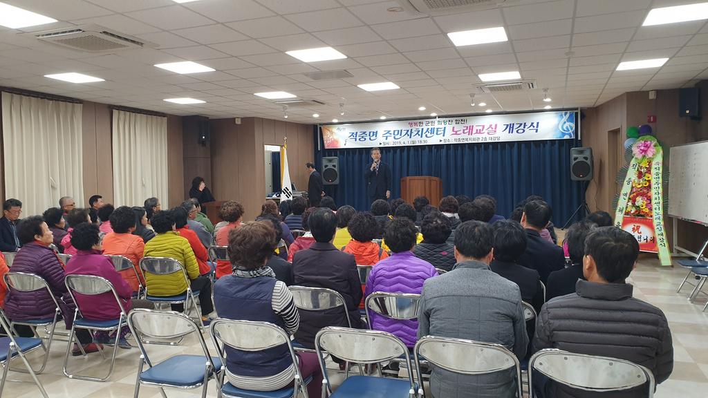 적중면주민자치위원회(위원장 정문식)은 지난 4월 1일 적중면복지회관 2층 대강당에서 전덕규 적중면장, 주민자치위원, 동부농협조합장, 사회단체장 등 많은 내빈이 참석한 가운데 적중면 주민자치센터 노래교실 개강식을 개최했다.