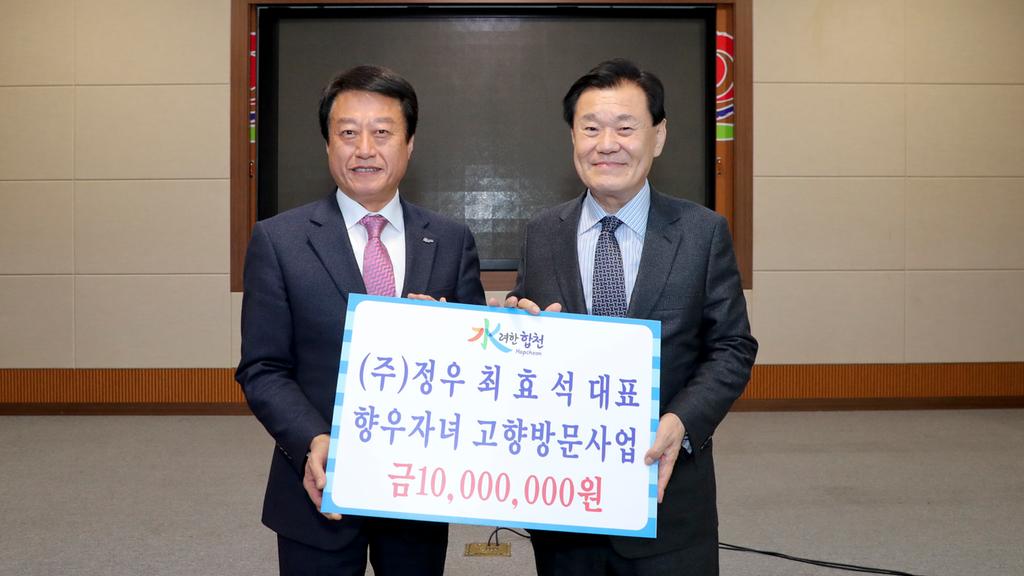 이임하는 최효석 회장은 “신임 지정도 회장을 중심으로 더욱 화합하고 단합된 향우회를 만들 것”을 당부하고 “전국 50만 재외합천향우연합회 활성화를 위해 향우 자녀들이 참여하는 향우자녀 고향방문사업에 마중물사업을 되기를 바란다.”며 기금 1천만원을 기탁했다.