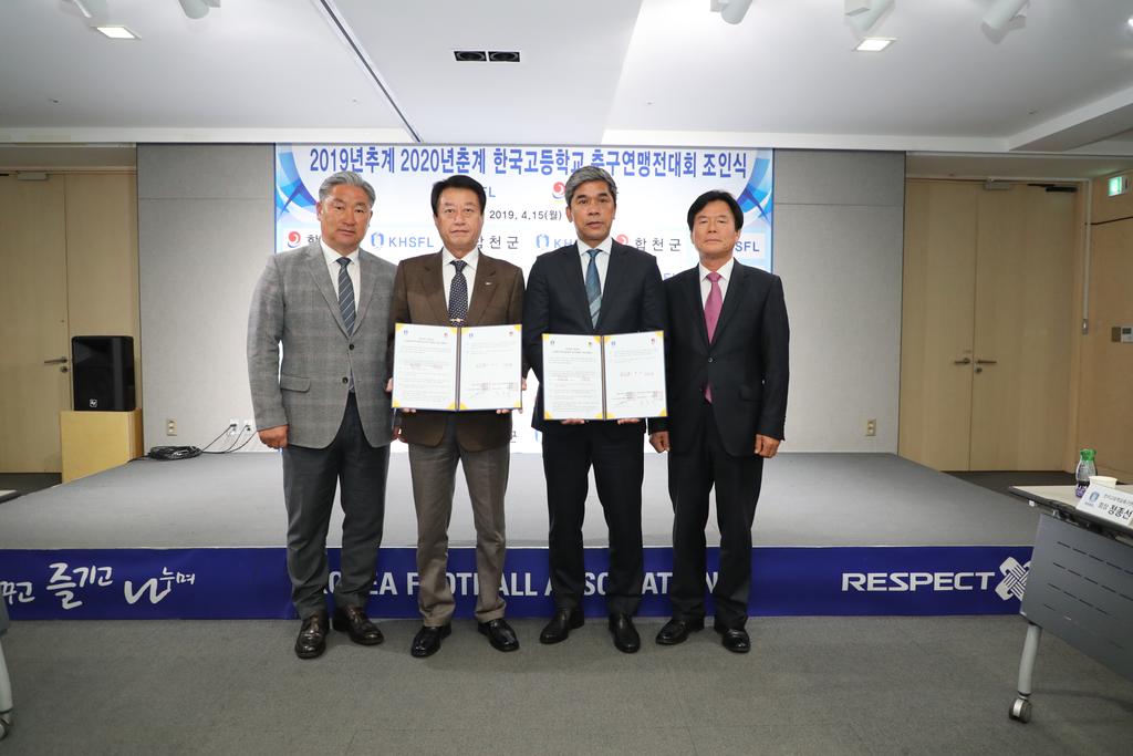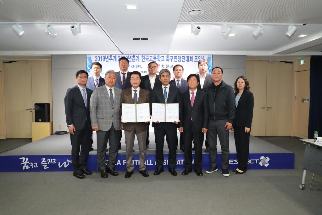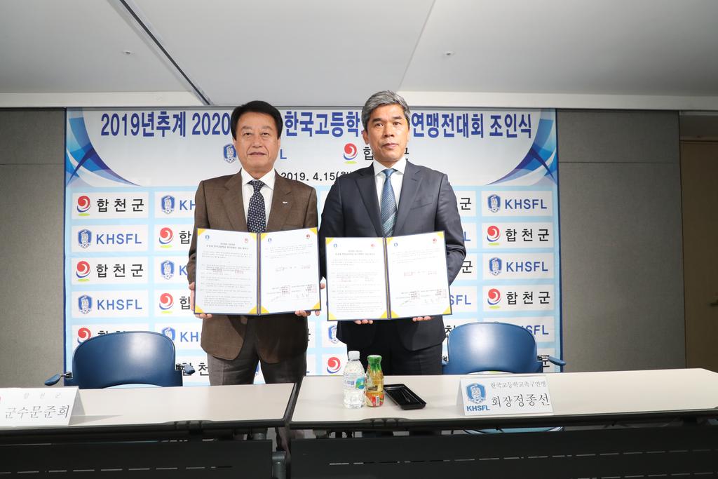 합천군(군수 문준희)은 15일 서울시 종로구에 위치한 축구회관에서 문준희 합천군수와 정종선 한국고등학교축구연맹 회장을 비롯한 임원 관계자 등이 참석한 가운데 ‘2019년 추계 · 2020년 춘계 한국고등학교축구연맹전’ 개최에 대한 협약을 체결했다.