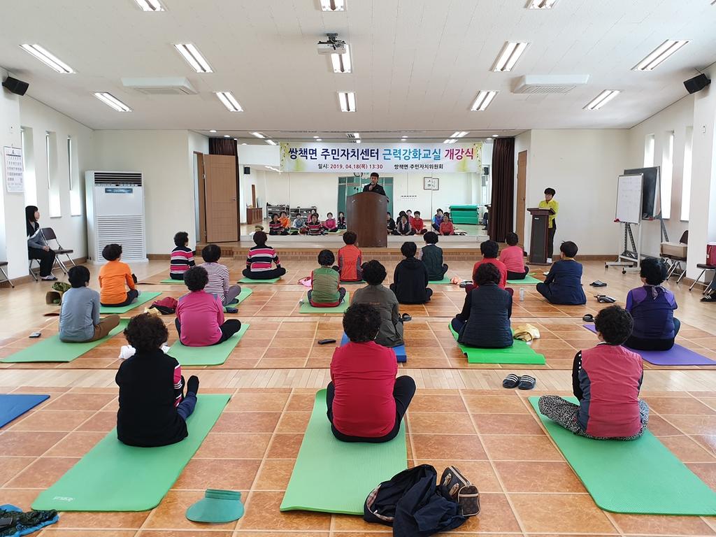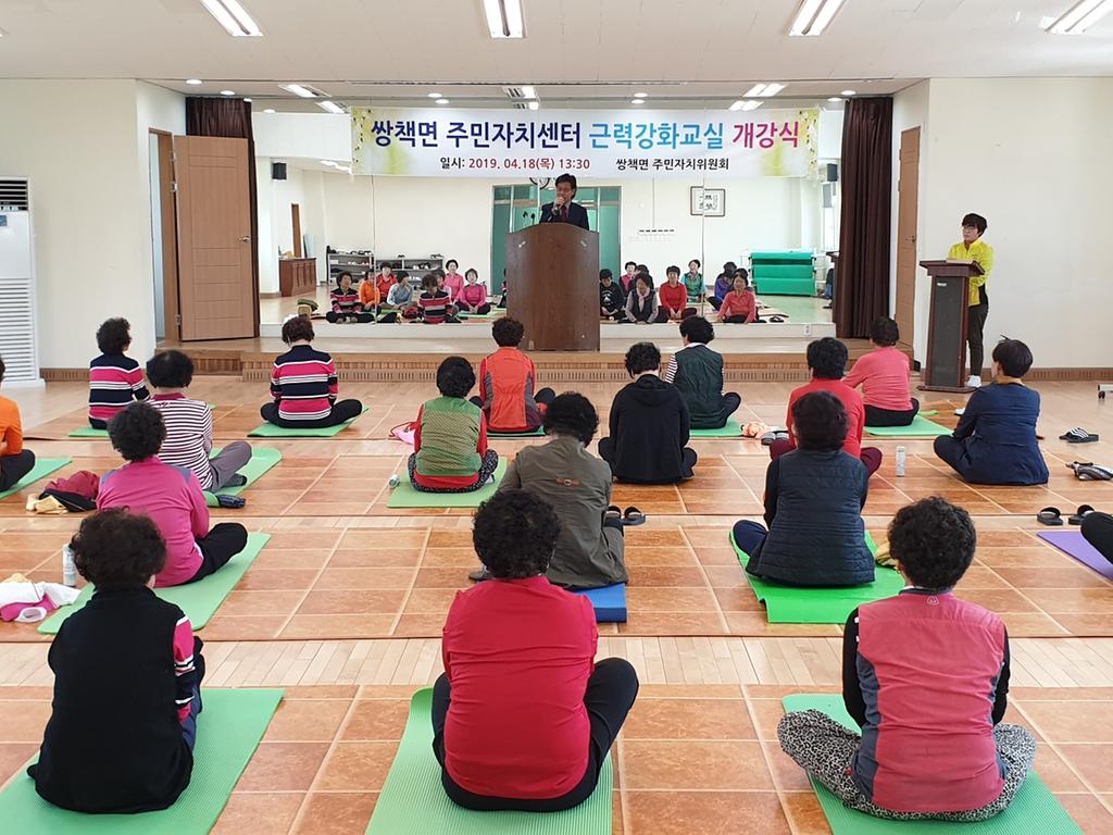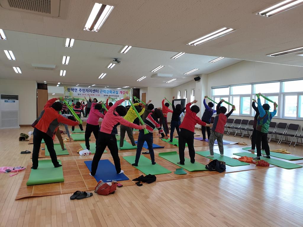 쌍책면 주민자치위원회(위원장 정화섭)는 18일 쌍책면 복지회관에서 주민자치위원, 정봉훈 군의원, 면직원 및 수강생 등 40여명이 참석한 가운데 근력강화교실 개강식을 가졌다.