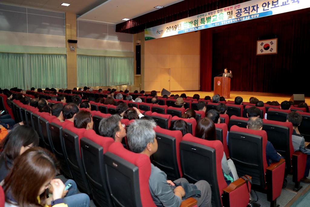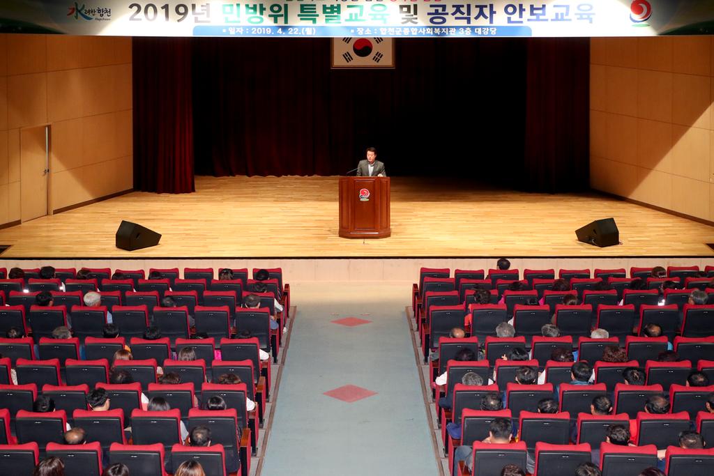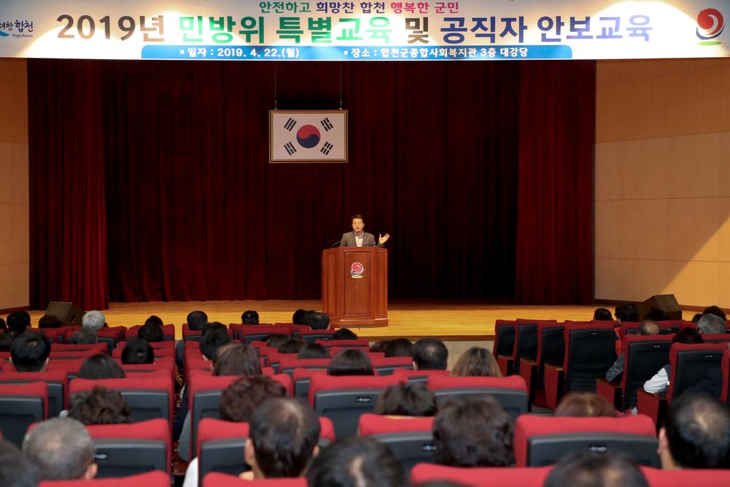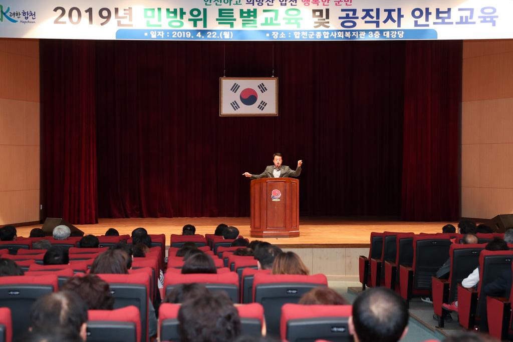 합천군(군수 문준희)은 지난 22일 오후 2시부터 합천군종합사회복지관 대강당에서 2019년 상반기 민방위 특별교육에 따른 민방위대원 및 지역민방위대장, 민방위 기술지원대원, 주부민방위대원, 그리고 공직자 400여명을 대상으로 ‘국가비상체제와 위기관’을 주제로 안보교육을 실시했다.