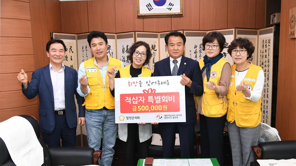 합천군의회(의장 석만진)는 29일 의회를 방문한 대한적십자사 봉사회 합천지구 협의회(회장 김행진)에 특별회비 50만원을 전달했다.