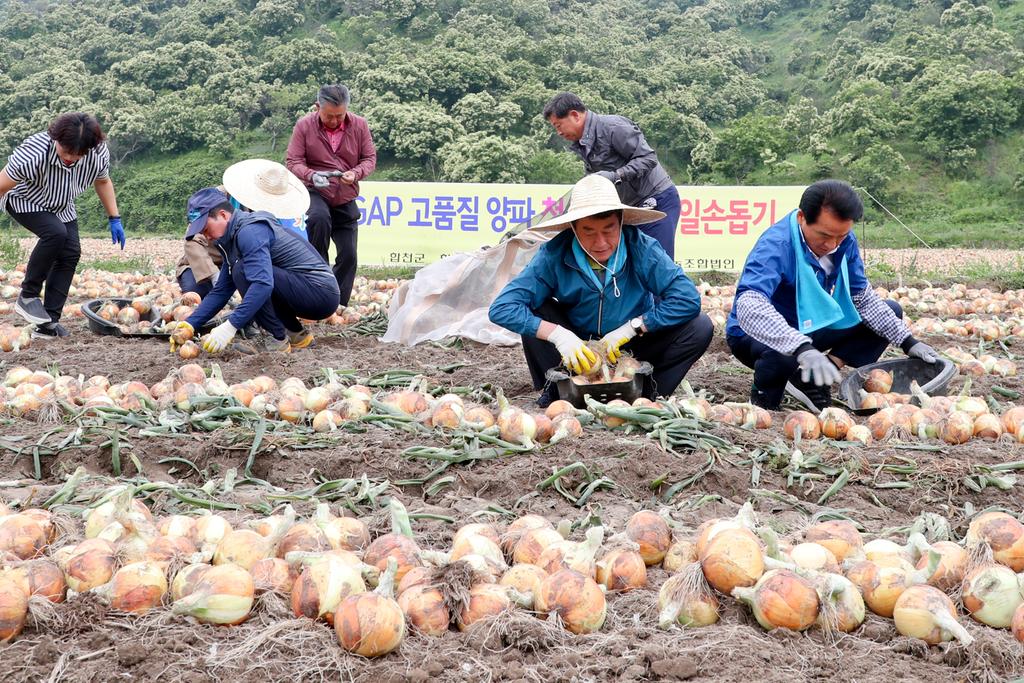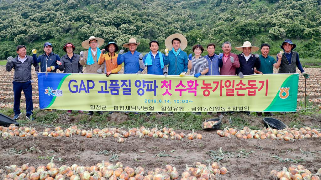 합천군(군수 문준희)에서는 지난 14일 가회면 외사리에서 문준희 군수, 석만진 군의회 의장, 정창화 농업기술센터소장, 손영진 농업지도과장, 최진현 가회면장, 김진석 새남부농협장, 장문철 합천유통(주) 대표이사와 박봉제 회장을 비롯한 인증농가 20명이 참석한 가운데 올해 GAP 인증을 받은 가회양파 공선회(가회면)의 양파 첫 수확을 격려하기 위해 일손돕기를 추진했다.