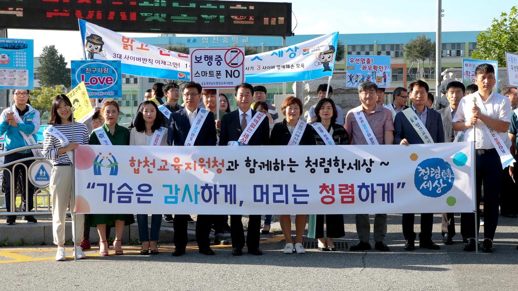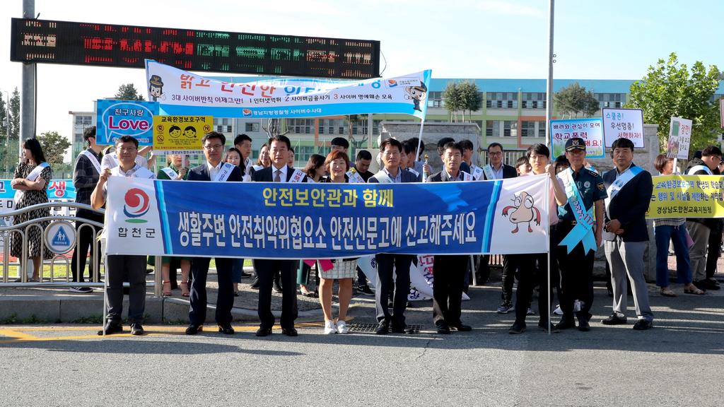 합천군(군수 문준희)은 지난 17일 합천중학교 앞에서 합천군, 합천경찰서, 합천교육지원청 관계공무원 및 합천중·고 선생님과 재학생, 청소년상담복지센터 등 관련기관 60여명이 참여한 가운데 학교폭력 근절을 위한 ‘안전하고 행복한 학교만들기 합동캠페인’을 펼쳤다.
