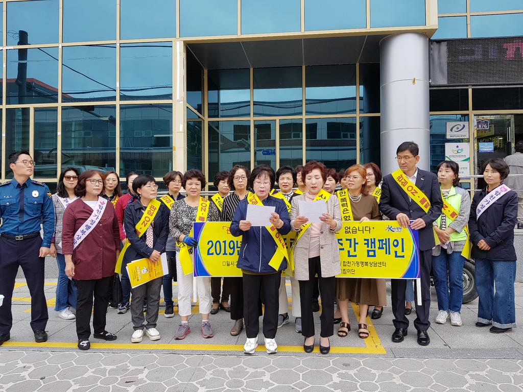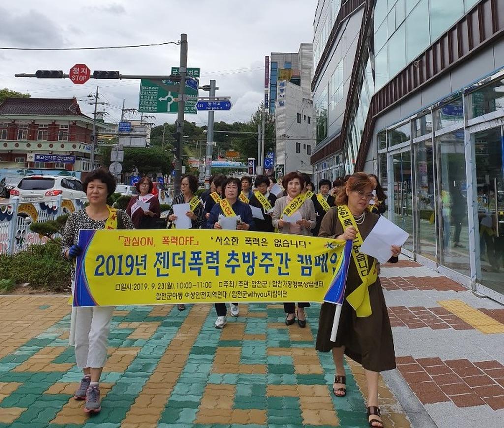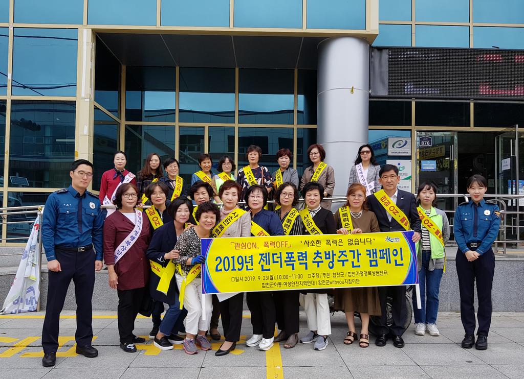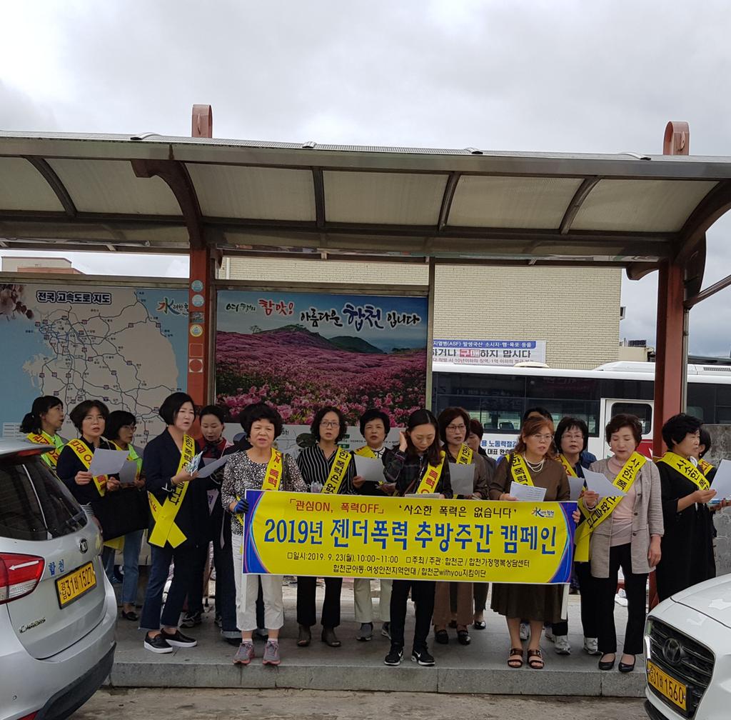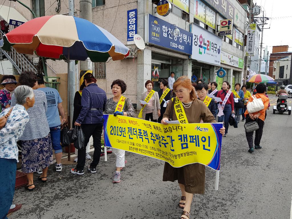 이 날 캠페인은 젠더폭력 추방주간(2019. 9. 16. ~ 9. 25.)을 맞이하여 젠더 폭력에 대한 군민의 관심과 공감대를 형성하고, 젠더 폭력을 예방하기 위해 실시되었으며, 「관심ON, 폭력OFF」‘사소한 폭력은 없습니다’라는 슬로건으로 합천삼성병원, 시외버스터미널, 합천시장, 합천군산림조합에서 캠페인이 진행ehotek.