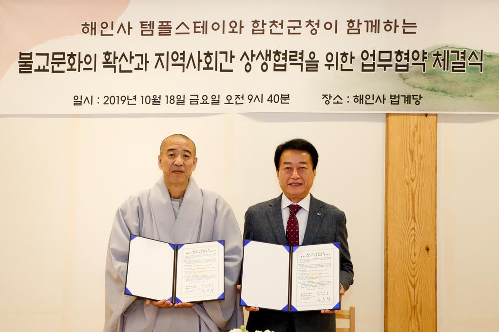 합천군(군수 문준희)은 지난 18일 해인사 법계당에서 해인사와 합천군청이 함께하는 불교문화의 확산과 지역사회 간 상생협력을 위한 템플스테이 업무협약(MOU) 체결식을 가졌다.
