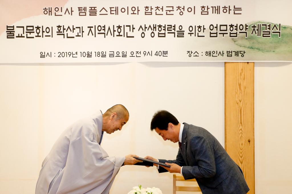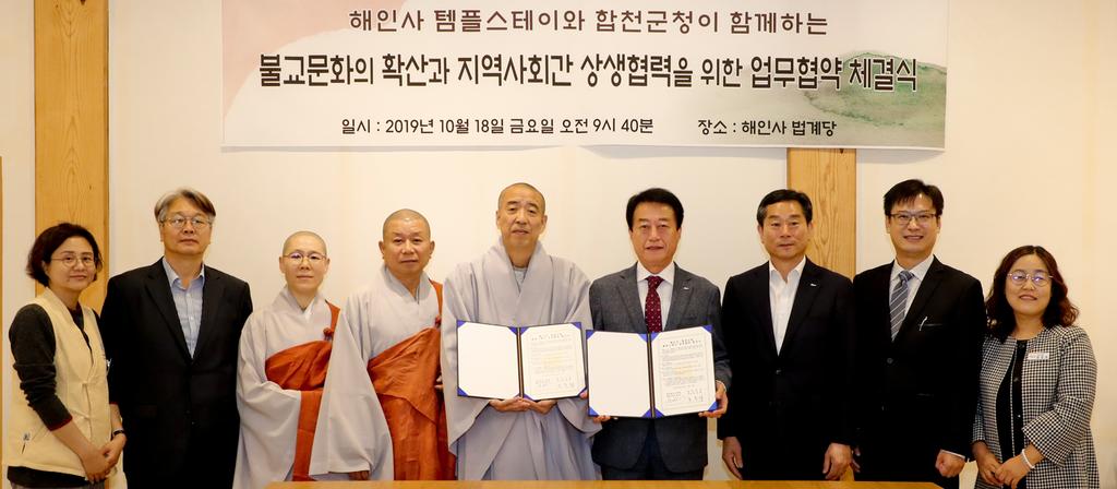 이번 업무협약은 지역사회와의 업무협력 체계를 구축한 것으로 이를 통해 합천군청 직원의 심리적 안정과 역량 개발을 도모하고 나아가 한국전통 불교문화의 교류와 발전에 기여할 수 있을 것으로 기대된다.