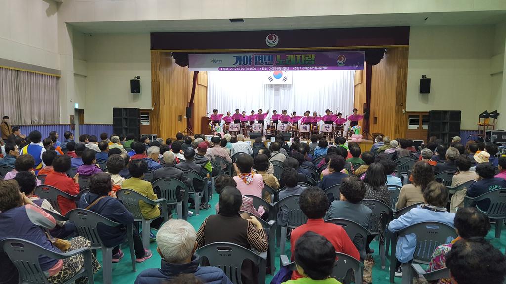 그리고 25일에는 면민 화합과 소통을 위한 면민노래자랑 및 음악회가 400여 명의 주민들이 참석한 가운데 각 마을 대표 14명의 노래실력 대결과, 가야면 출신 가수들과 지역 내 예술단체들의 축하공연이 함께 어우러져 면민들에게 멋진 시월을 선사했다.