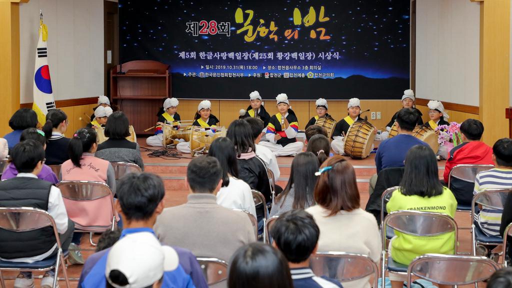 시상식에 앞서 우리군 출신인 소민호 작가의 문학특강과 합천어린이풍물단의 축하공연이 진행됐으며, 이어 한글사랑 황강백일장 입상자의 시상과 대상을 수상한 초등부 김유빈 학생의 ‘엄마손’ 낭송을 들으며 깊어가는 가을 저녁 문학의 향내를 뜸뿍 느끼게 하는 시간이 되었다.