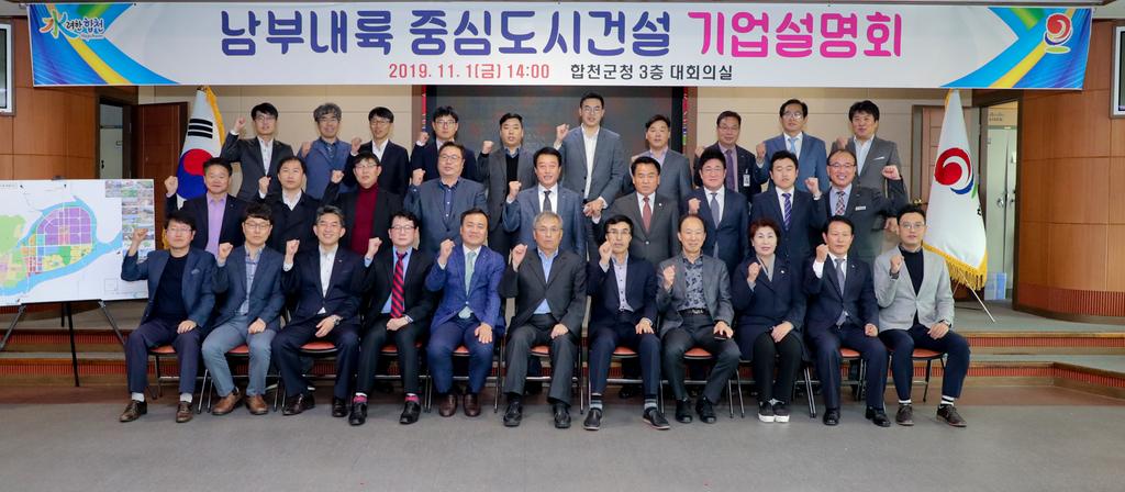 합천군은 지난 11월 1일 군청 대회의실에서 국내외 굴지의 기업체, 금융권 관계자 등 30여명이 참석한 가운데 합천군 남부내륙중심도시건설 기업설명회를 개최했다고 밝혔다.