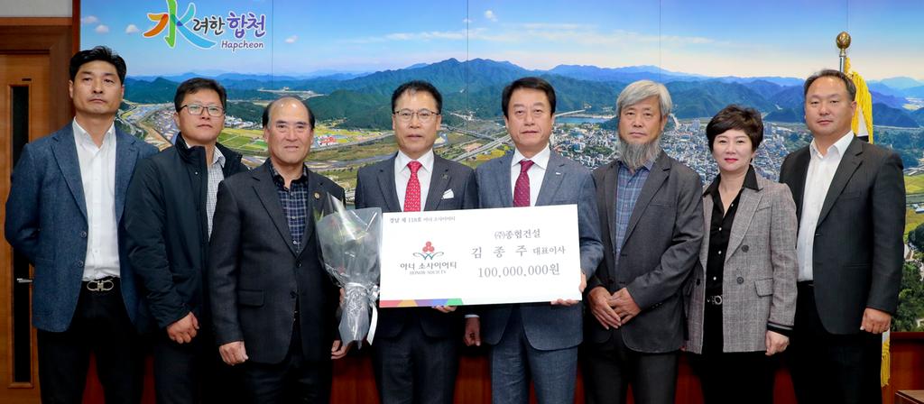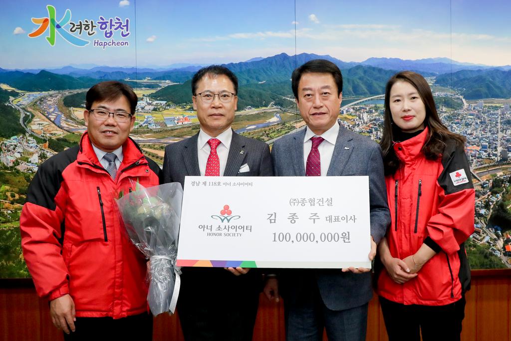 대한전문건설협회 경상남도회 김종주 회장[(주)종협건설 대표]은 지난 4일 합천군청 군수실에서 문준희 군수, 유병설 경남사회복지공동모금회 사무처장 등이 참석한 가운데 1억원의 성금을 기부하기로 약정하고 아너 소사이어티(Honor Society) 가입서에 서명했다.