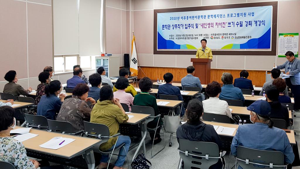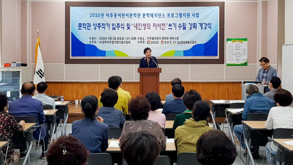 합천군과 (사)향파이주홍기념사업회는 지난 6월 2일 오후 2시 30분 이주홍 어린이문학관 세미나실에서 문준희 군수와 향파기념사업회 관계자, 입주 작가, 내 인생의 자서전 쓰기 수필강좌 수강생 등 30여 명이 참석한 가운데 2020 이주홍 어린문학관 문학레지던스 사업 및 내 인생의 자서전 쓰기 수필 강좌 개강식을 가졌다.