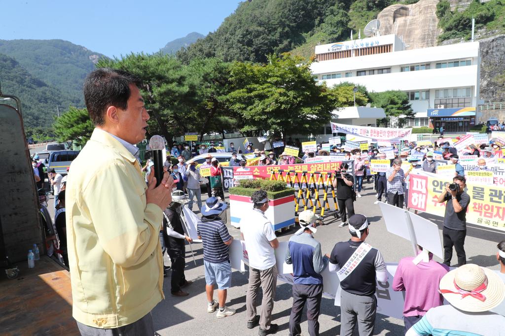 합천군청년연합회(회장 이성근)와 율곡 ․ 쌍책 주민 300여명은 19일 오전 9시 30분 한국수자원공사 합천지사 정문 앞에서 물 관리 실패로 입은 수해에 대한 100% 전액 보상을 촉구하는 집회를 했다.