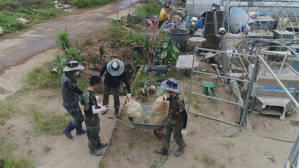 철재가 휘어지고, 내부에 쓸 만한 농자재라고는 찾아볼 수 없이 모두 쓰레기로 변한 130여동 하우스의 내부 폐자재 정리, 토사제거, 철구조물 해체작업은 물론이고, 상류로부터 쓸려 내려온 하천 제방의 쓰레기 수거까지 장병들은 궂은일을 마다하지 않았다.