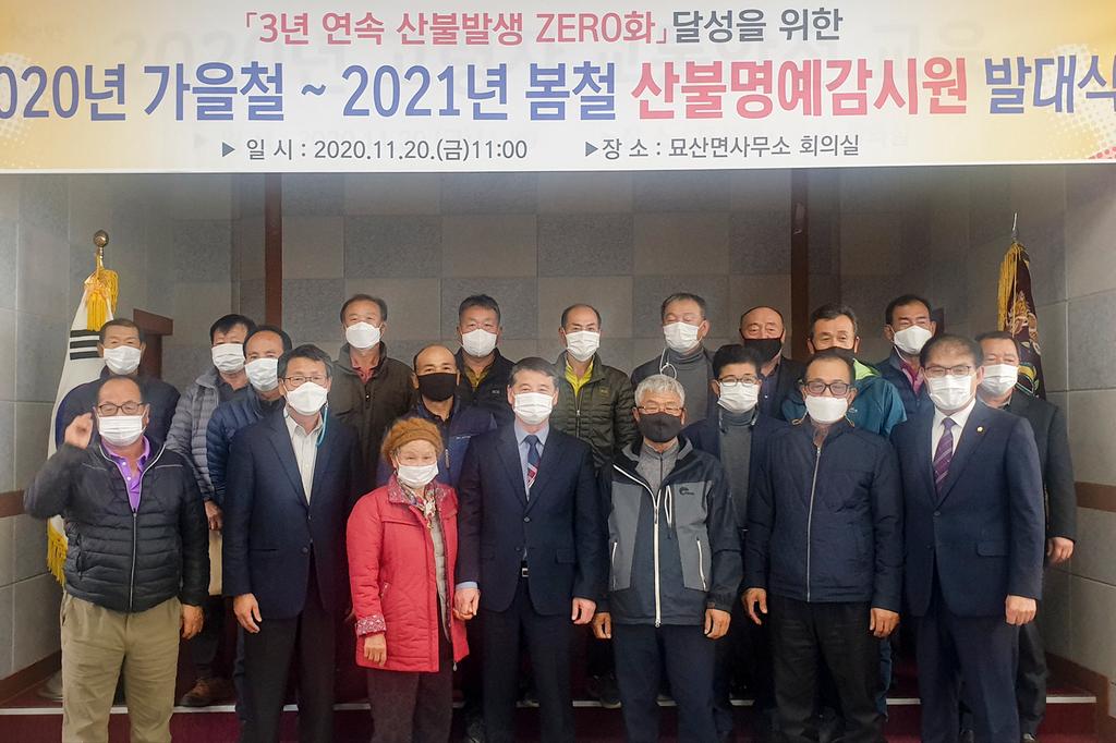 묘산면(면장 홍석천)에서는 2020년 가을철 ~ 2021년 봄철 산불종합 대책기간중 산불취약지에 대한 선제적이고 효과적인 대응을 위해 20일(금)11시 30분 면사무소 회의실에서 명예 감시원 발대식을 갖고 모든 가용자원을 총동원하여 본격적인 산불예방 활동에 돌입했다.