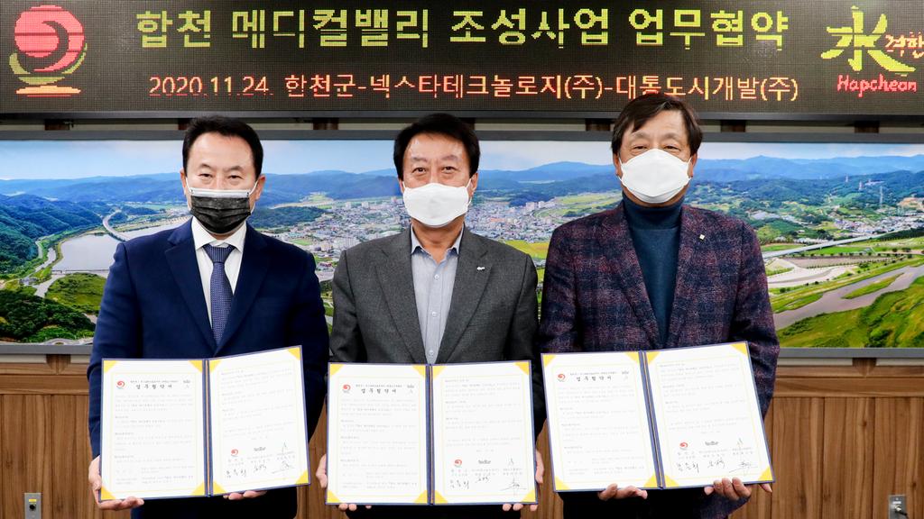 합천군(군수 문준희)은 24일 군청 소회의실에서 넥스타테크놀로지(주) 김정덕 회장과 대통도시개발(주) 최우열 회장은 합천메디컬밸리 조성사업의 원활한 사업 추진과 상호신뢰를 바탕으로 성공적 사업완수를 위해 함께 노력하자는 투자유치 양해각서 체결식을 가졌다.