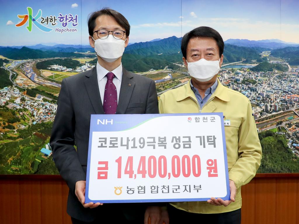 합천군(군수 문준희)은 NH농협은행 합천군지부(지부장 강문규)에서 지난 6일 합천군청 방문해 코로나19극복 성금 1,440만원과 700만원 상당의 농산물 꾸러미 이웃돕기 성품을 기탁했다고 밝혔다. 앞서 농협 합천군지부에서는 지난달에 이미 1,000만원의 코로나19 극복 성금을 기탁한 바 있다.