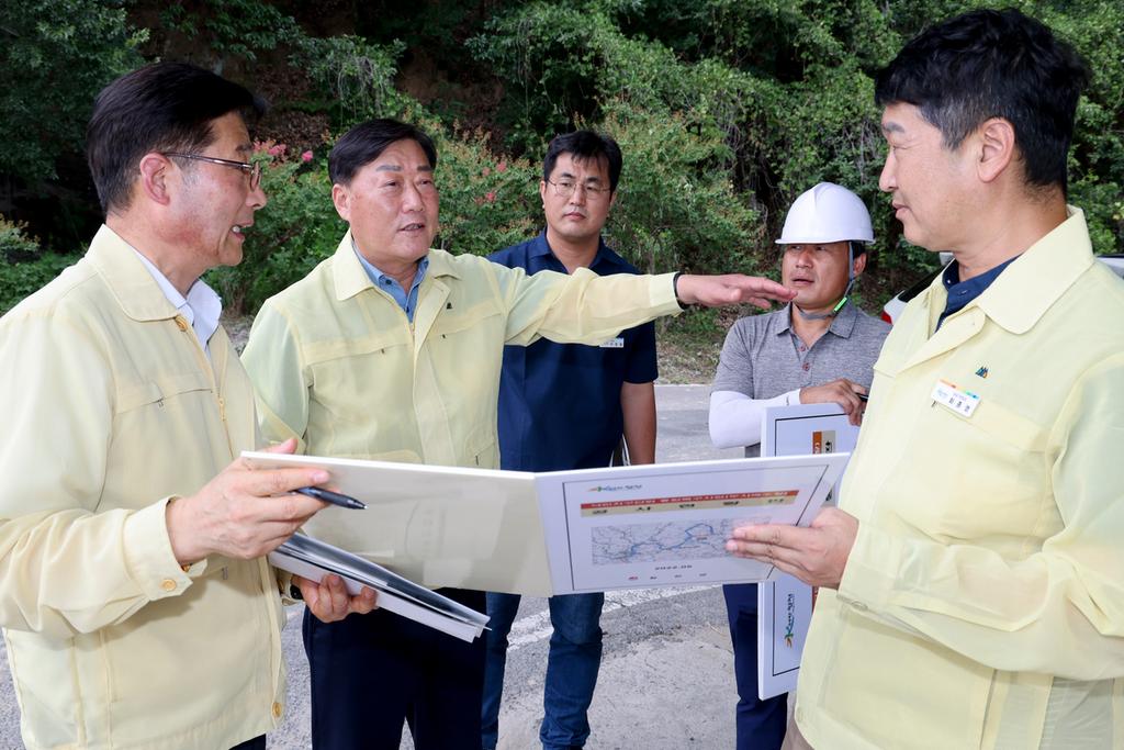 현장 내 안전관리 실태 및 비상연락체계 구축 현황, 우기 전 피해방지를 위한 주요공정 완료 여부와 최근 장마나 집중호우 등에 따른 관계기관(한국수자원공사 합천지사, 한국농어촌공사 합천지사 등)간의 유기적인 협조체계구축 및 수해피해를 대비한 합천군 자체 조기대응 매뉴얼 준비와 대응태세 등에 대해 강도높게 주문했다.