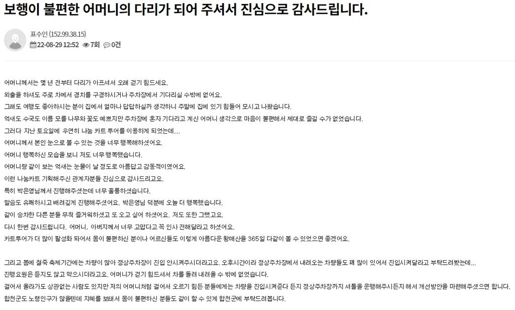 봄철 철쭉개화기간 나눔카트 프로그램을 이용했던 표수인 씨는 “보행이 불편한 어머니의 다리가 되어 주셔서 진심으로 감사드립니다”며 나눔카트 이용 소감을 전했다.