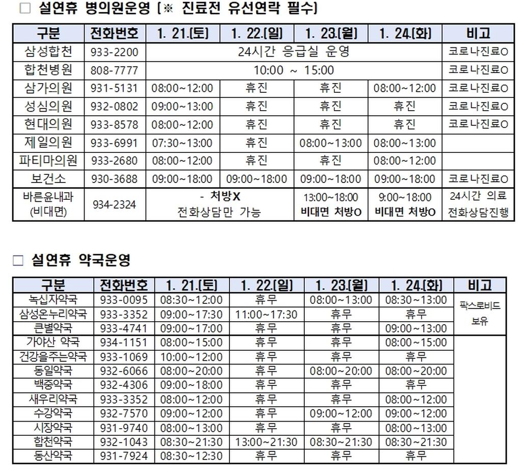 설 연휴 비상진료 및 약국, 코로나 선별진료소 등 운영