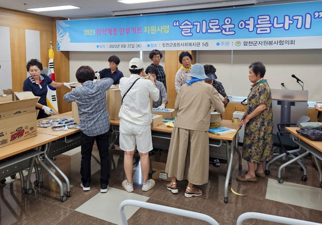 합천군자원봉사협의회(회장 김용철)는 22일 종합사회복지관 5층 다목적실에 김용철 회장을 비롯한 읍·면회장 등 20여명이 참석해 읍·면별 취약계층 340가구에 전달할 여름나기 키트를 제작했다.
