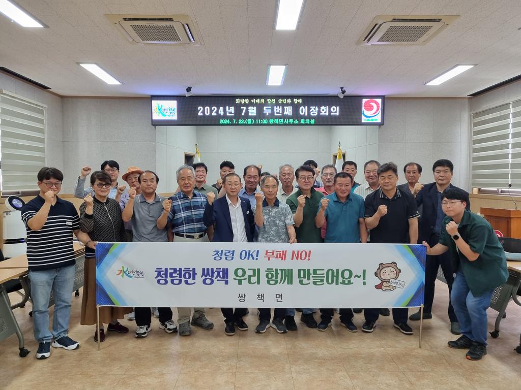 또한, 이날 이장회의와 더불어 청렴 결의대회와 일회용품 사용 줄이기 환경 캠페인을 통해 다함께 청렴한 쌍책 만들기와 일회용품 줄이기에 동참하는 시간도 함께 가졌다.
