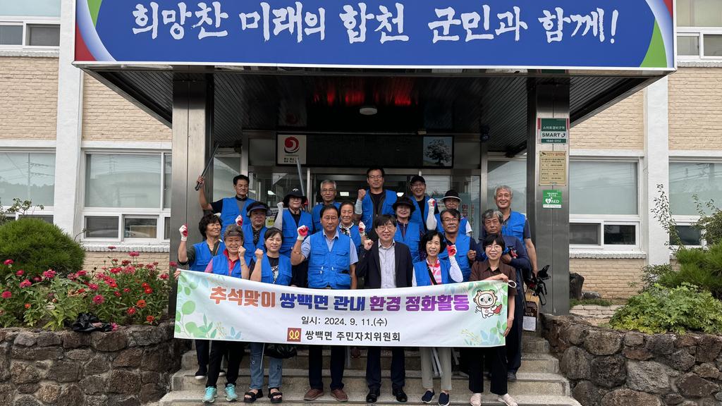 합천군 쌍백면 주민자치위원회(위원장 최금석)는 11일 위원 등 20여명이 참석한 가운데 면사무소 2층 회의실에서 회의를 개최하고, 회의 후 추석맞이 관내 환경정화 활동을 실시했다.