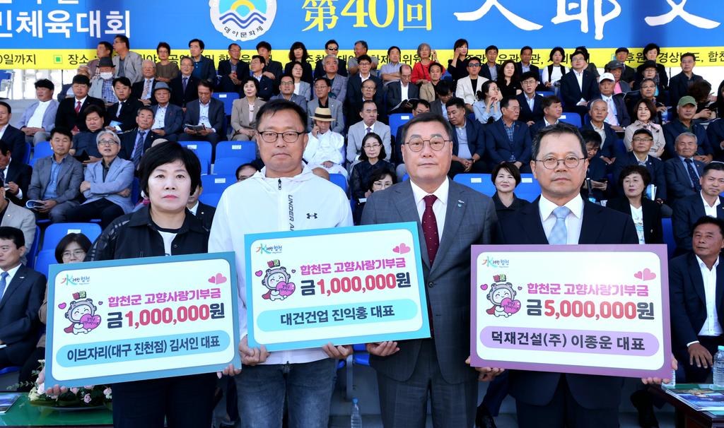 합천군은 제40회 대야문화제와 제43회 군민 체육대회, 제35회 군민의 날을 맞아 덕재건설 이종운 대표를 비롯한 여러 인사들이 고향사랑기부금을 기탁했다고 밝혔다.