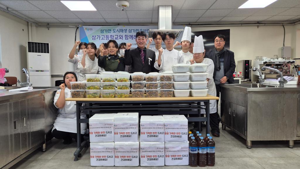 이번 봉사는 삼가면 도시재생 사업인 ‘삼가 한우브랜드UP사업’의 일환으로, 식육식당 예비 종사자 역량 교육에 참여한 삼가고등학교 학생들과 함께 지역 사회와 상생을 도모하기 위해 기획되었다. 학생들은 그동안 배운 내용을 바탕으로 직접 국과 반찬을 조리해 도시재생 사업구역 내 경로당에 전달하였다.