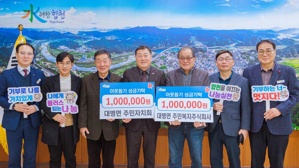 합천군(군수 김윤철)은 6일, 합천군 대병면 주민자치회(회장 하상도)와 대병면 주민복지주식회사(대표 권재영)가 합천군청을 방문해 이웃돕기 성금으로 각 100만원을 기탁했다고 밝혔다.