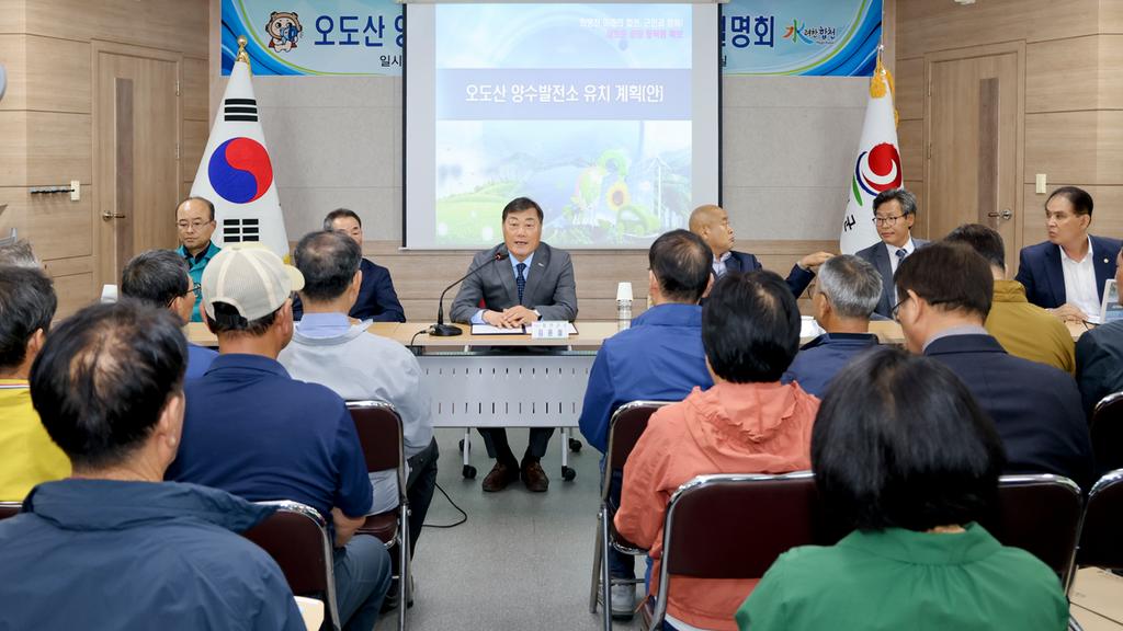 신규 양수발전소 유치는 지역주민의 동의 등 주민 수용성이 가장 중요하다. 이에 합천군은 지난 2023년부터 오도산 양수발전소 주변 주민들의 사업에 대한 이해도 증진과 궁금증 해소 등 주민 수용성 확보를 위해 봉산면민을 대상으로 사업설명회(4회, 207명), 찾아가는 마을별 사업설명회(8회, 199명) 및 양수발전소 견학(7회, 217명) 등을 추진하고 있으며 앞으로도 주민 수용성 확보를 위해 모든 행정력을 집중할 예정이다.