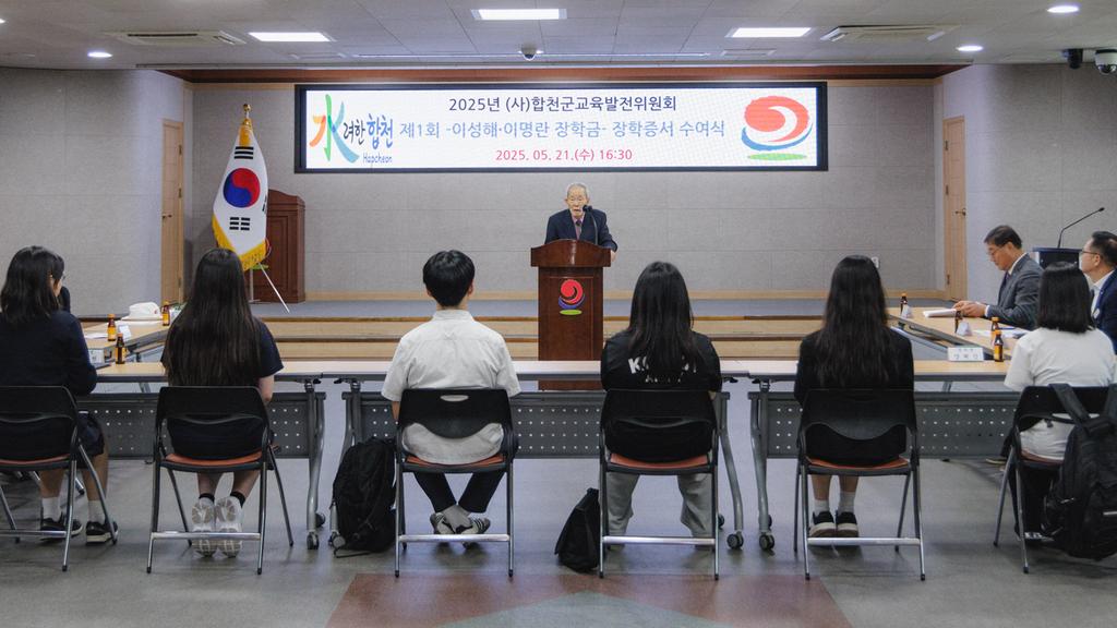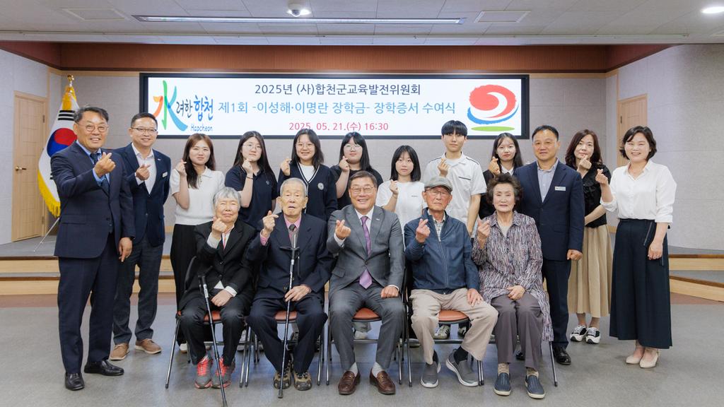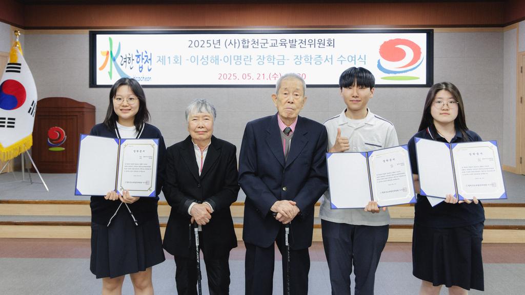 합천군교육발전위원회(이사장 김윤철)은 5월 21일 합천군청 대회의실에서 ‘이성해‧이명란 장학금’ 장학증서 수여식을 개최하고, 지역 고등학생 6명에게 장학증서를 전달했다.