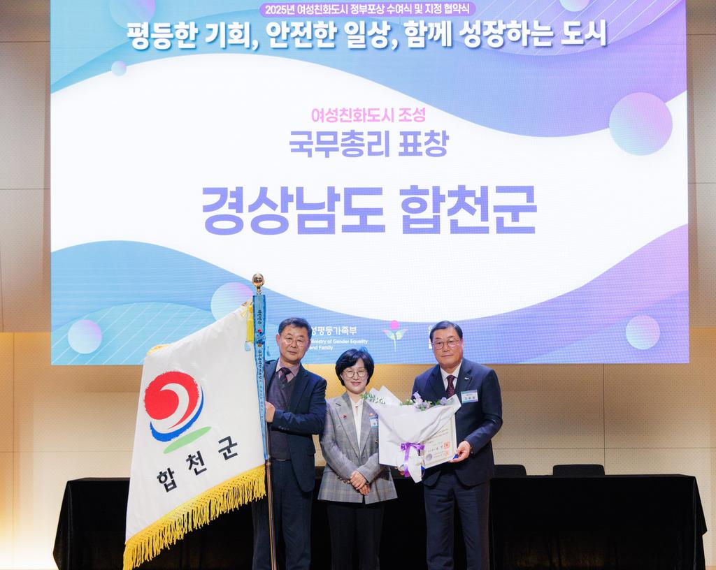 합천군(군수 김윤철)은 26일 성평등가족부가 주관한 ‘2025년 여성친화도시 정부포상 수여식’에서 경남 지역 유일하게 국무총리 표창을 수상했다. 2023년 11월 여성친화도시로 지정된 후 2년만에 이루어낸 쾌거이다.