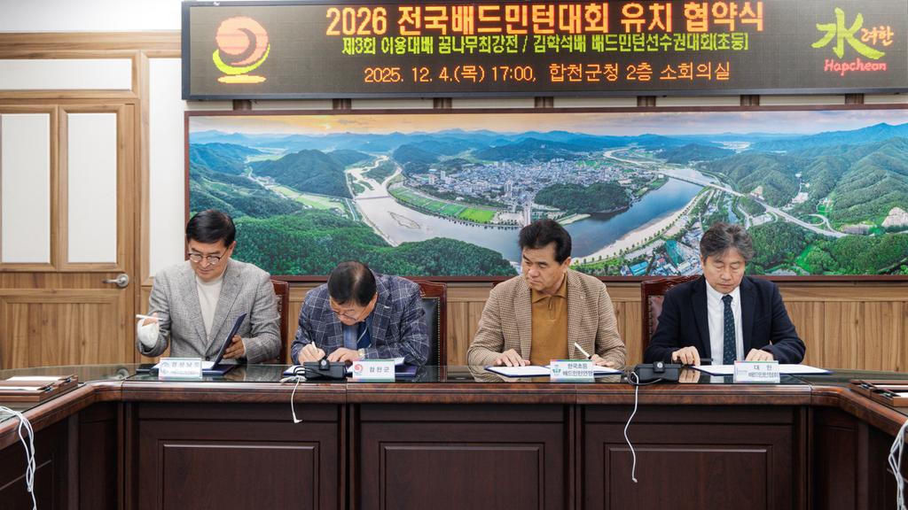 합천군(군수 김윤철)은 12월 4일 합천군청에서 ‘제3회 이용대배 꿈나무 최강전’과 ‘2026 김학석배 전국 종별 배드민턴선수권대회(초등)’ 총 2건의 전국규모 배드민턴대회 유치 협약을 체결했다고 밝혔다.