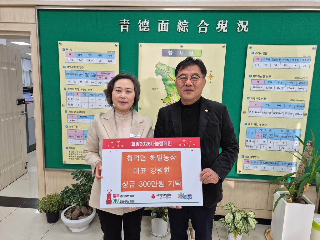 합천군 청덕면 해밀농장 강원환 대표는 8일 청덕면사무소(면장 이은숙)를 방문해 관내 어려운 이웃을 돕기 위한 성금 300만원을 기탁했다.