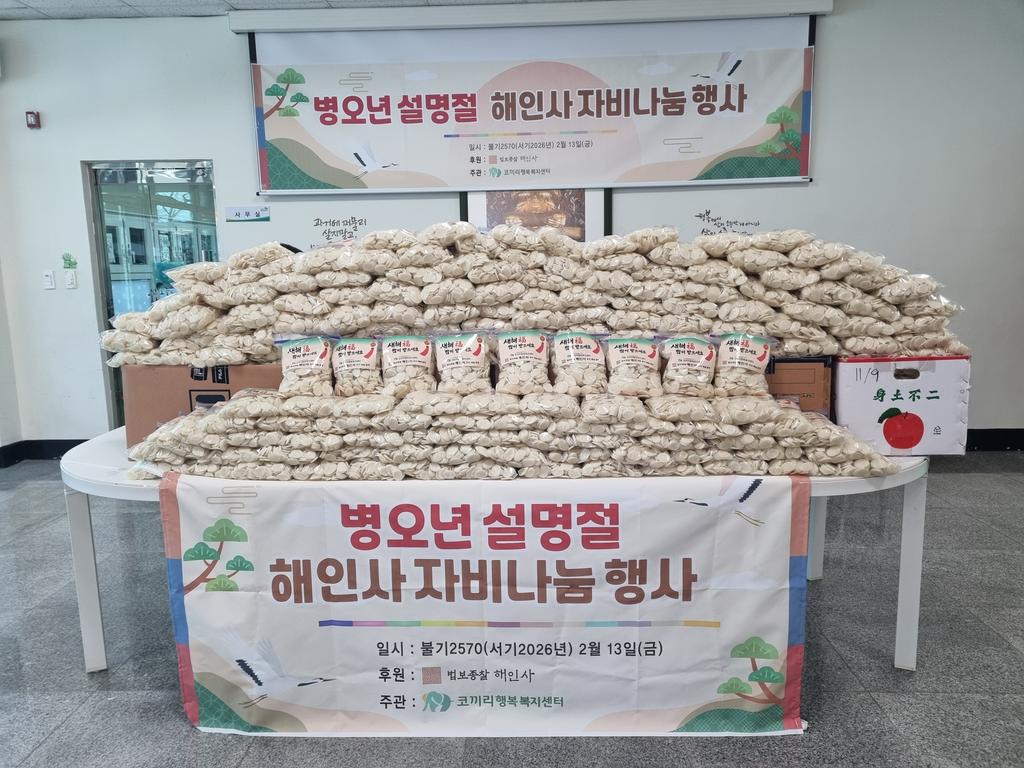 법보종찰 '해인사'와 조계종 사회복지재단 산하 '코끼리행복복지센터'가 2월13일 봉산, 묘산, 가야, 야로면의 노인맞춤돌봄서비스 대상자 어르신 850명을 대상으로 떡국떡을 담은 상자를 직접 전달하는 설맞이 행복나눔행사를 진행했다.